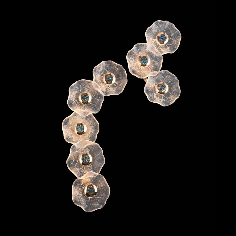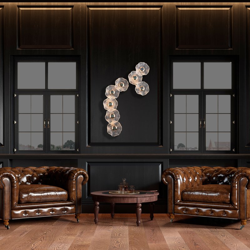 Crafted from textured glass and finished in gold, this modern wall sconce radiates elegance. Its vertical structure adds height and sophistication to luxury interiors, creating a warm, ambient glow.