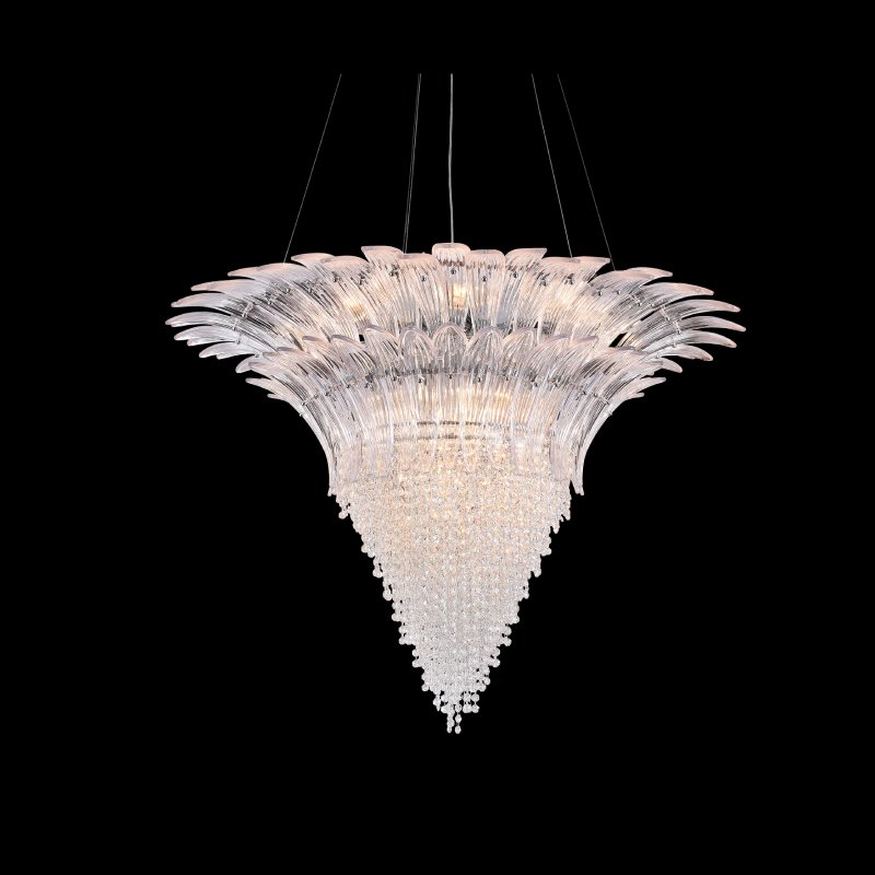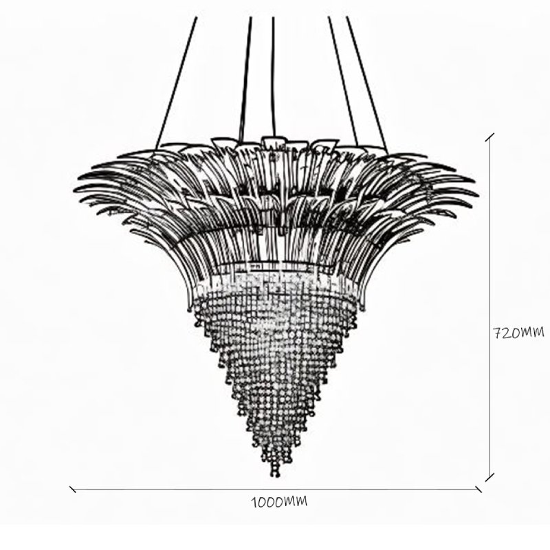 A masterpiece of opulence, this grand chandelier features an expansive cascade of hand-textured glass elements arranged in a striking inverted design. The luxurious gold finish elevates its architectural form, while the intricate detailing of the artisan glasswork captures and refracts light beautifully. Ideal for grand entrances, ballrooms, or statement ceilings.